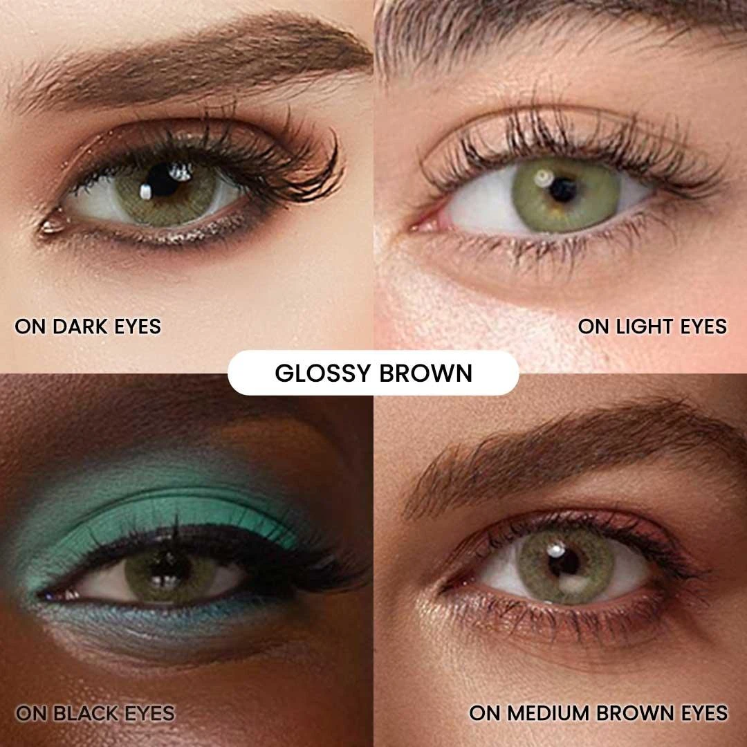 - Glossy Brown from EyeCandys contacts collection is a sandy hazel that is great for brown eyed wearers who want to go 1-2 shades lighter, especially if it’s their first time with light lenses. This shade will still look natural with yellow, tan and black skintones.