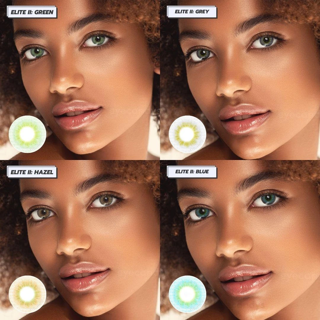 Elite II 3-tone lenses are among the most comfortable colored contacts available! Made from 57% Tetrafilcon A and 43% water, they are moist and flexible to fit your eyes perfectly! They are designed with asphyerical shape that ensures ideal tear circulation – keeping your eyes moist. PLUS – the unique material contains UV-A and UV-B protection – perfect for summer!