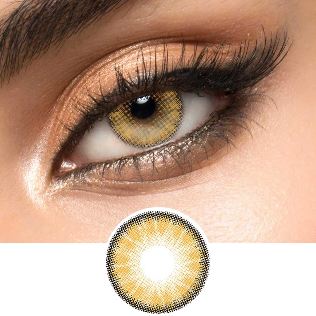 - A light, warm brown color designed to blend naturally on any eye color, the Toffee Brown colored contact lenses are best for those who want to enhance their eyes effortlessly. Light to translucent streaks allow your natural eye color to peak through for an elevated organic look.